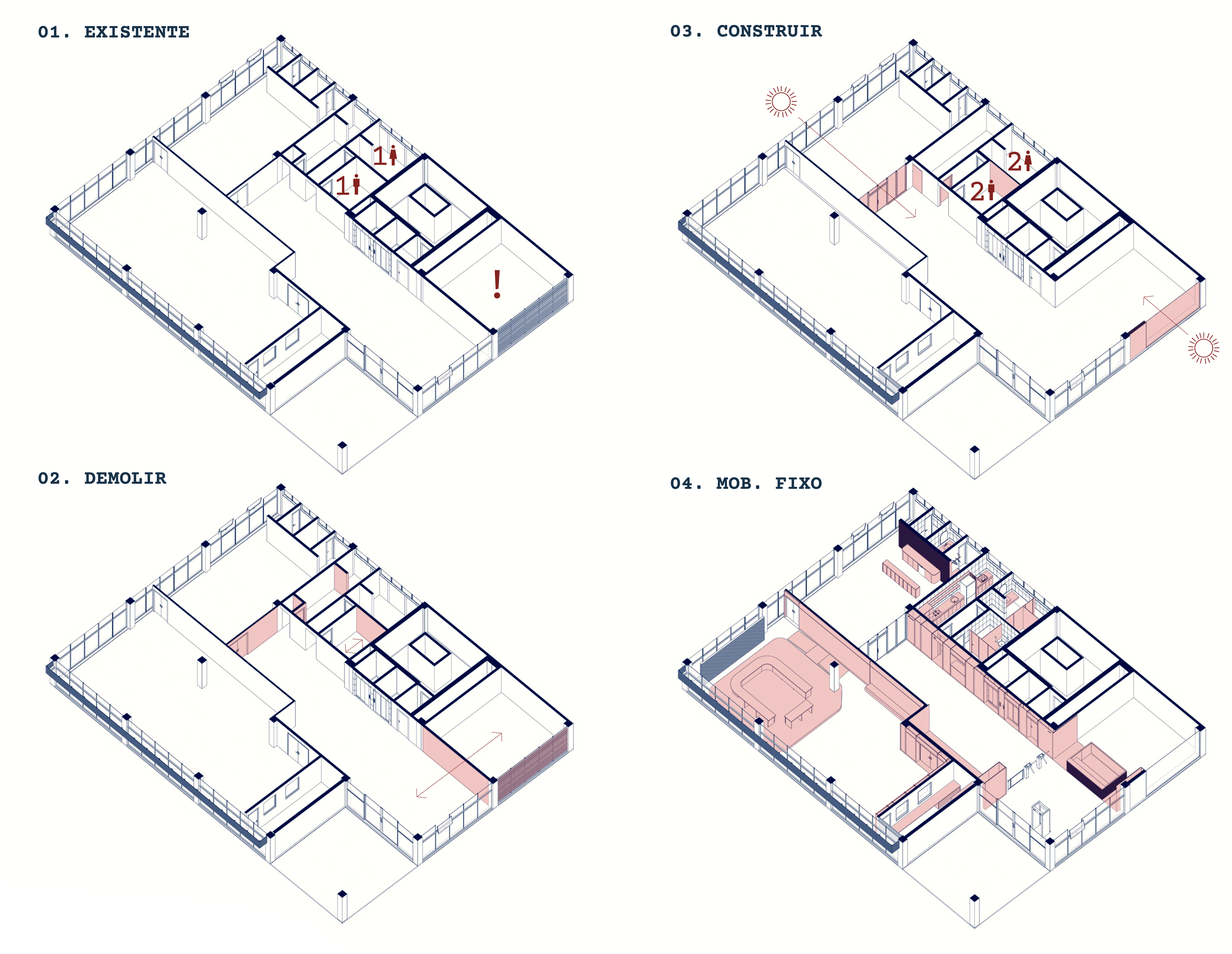 Visto isso, a proposta inclui a demolição de poucos trechos de alvenaria, porém estratégicos para se obter uma significativa melhoria, trazendo maior aproveitamento e integração espacial, garantindo acessibilidade universal a todos os ambientes e, ainda, promovendo uma melhor relação entre interior/exterior, com intervenções que tiram partido da iluminação natural e do contato visual com a rua.