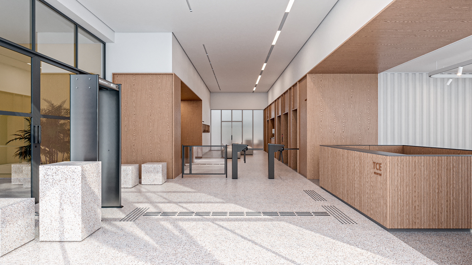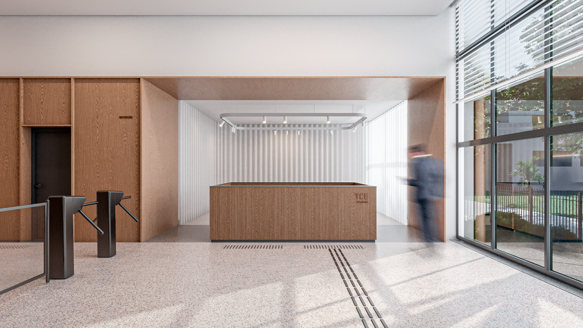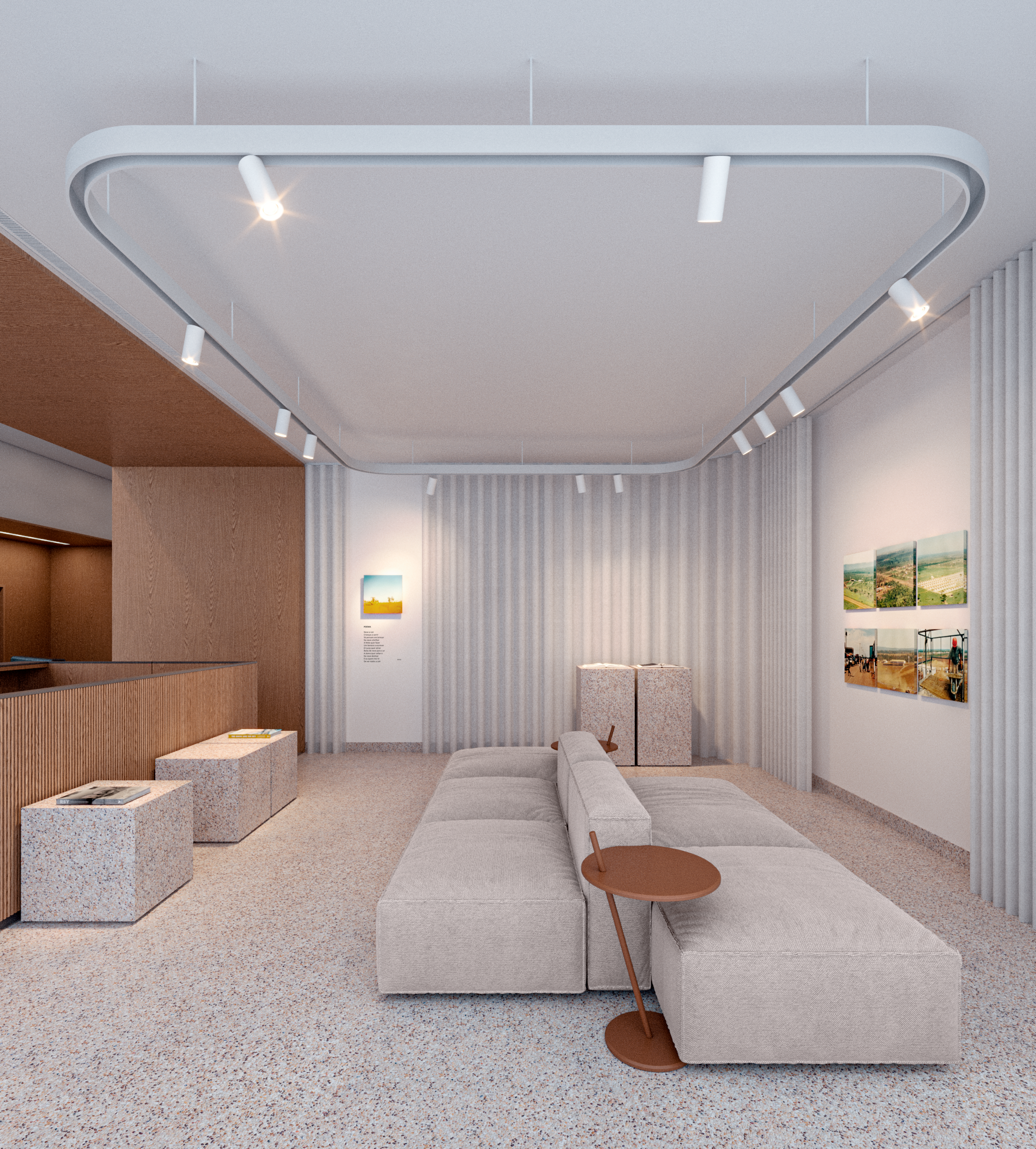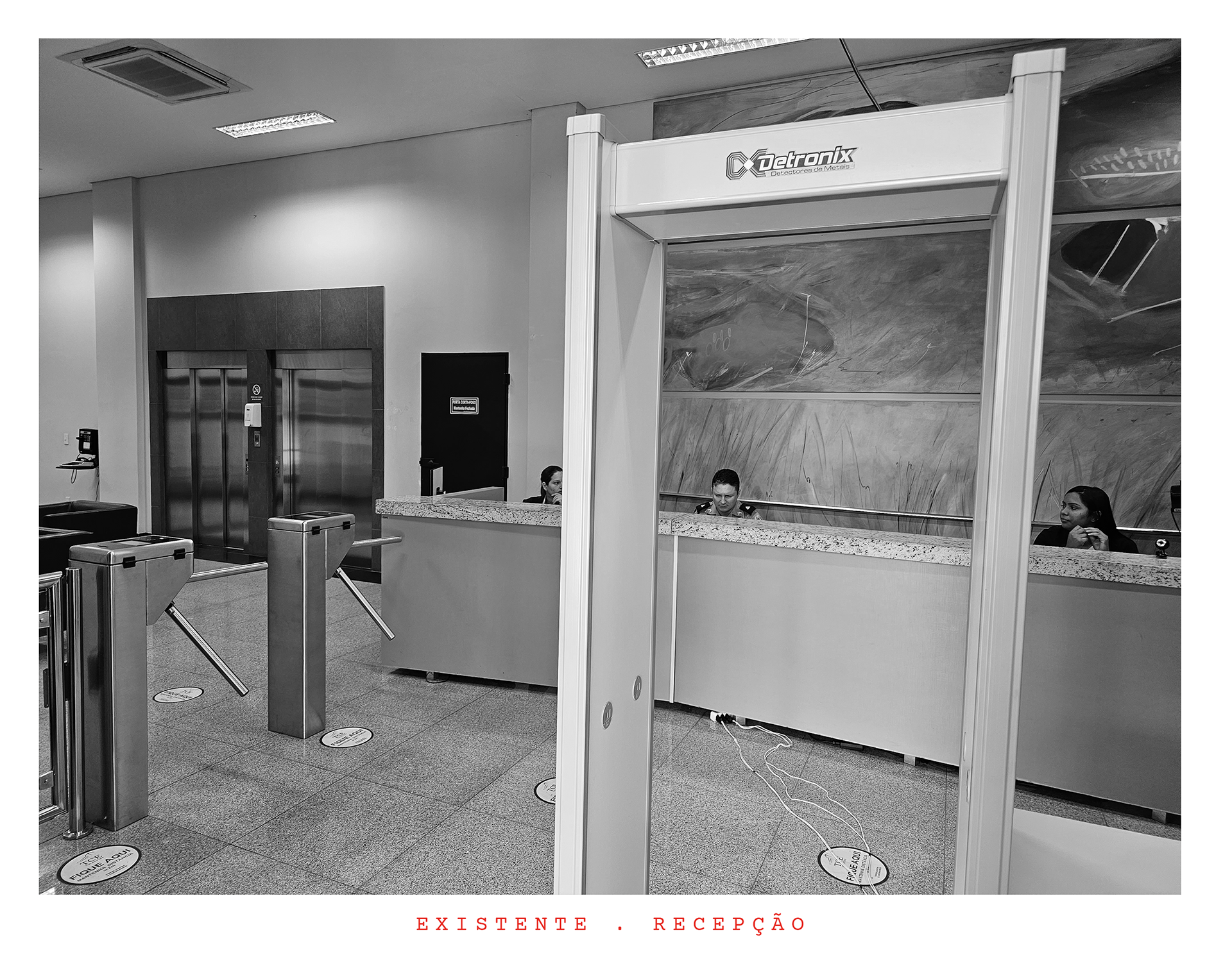 A readequação da Recepção permite uma nova configuração ao espaço que proporciona mais clareza e coerência espacial. O volume do balcão de atendimento atua como divisor de dois importantes espaços: a entrada imediata, onde localizam-se os equipamentos de controle e segurança; e, em sua parte posterior, cria-se um espaço ainda de acesso ao público geral, porém, consequentemente, mais reservado, o que permite abrigar diferentes usos.