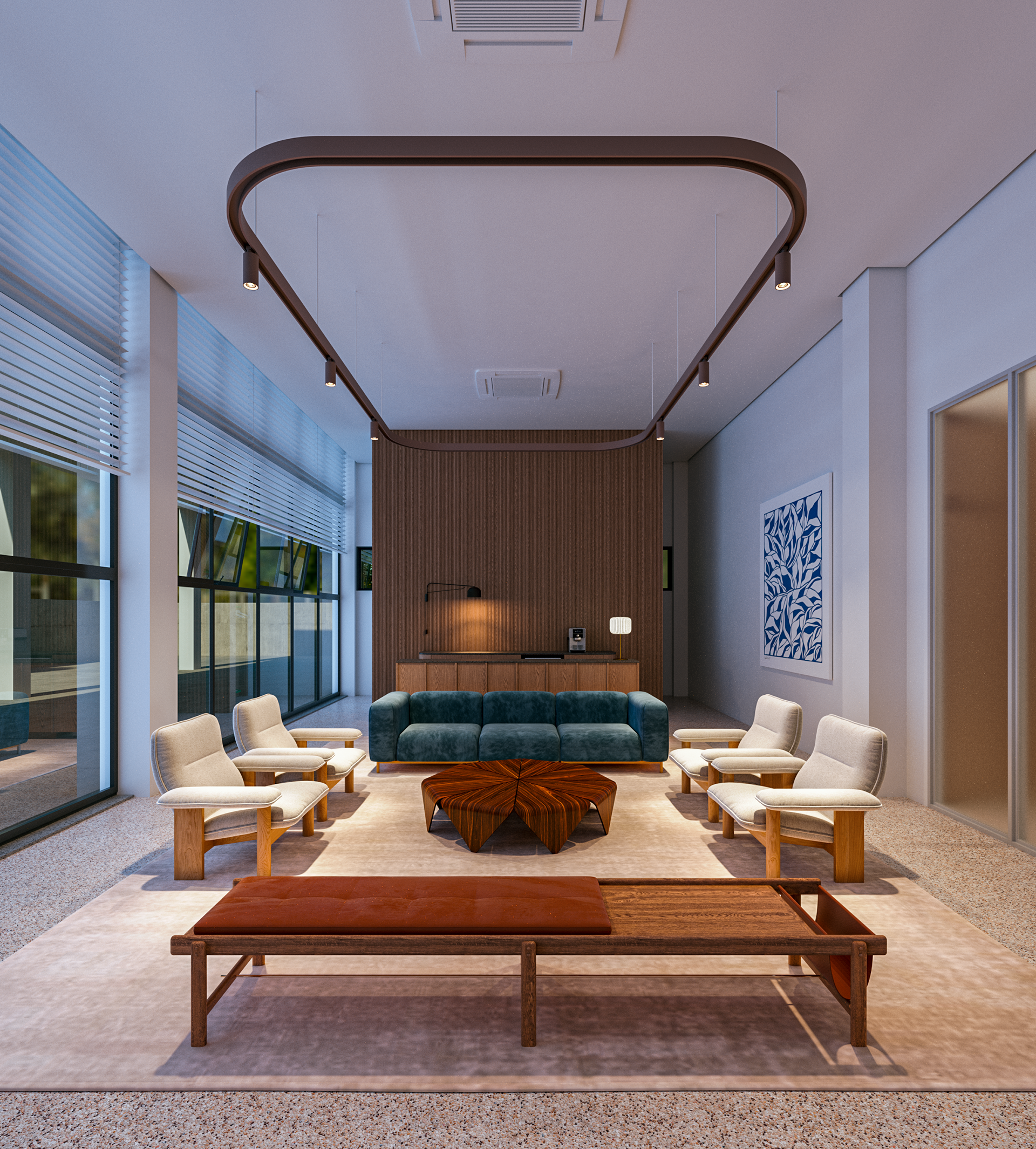 Aliado aos elementos mais fixos que compõem a proposta, optou-se por trabalhar mobiliário solto pensado para garantir flexibilidade de usos. Essa estratégia pode ser observada principalmente na área do Foyer da Recepção, onde, a partir da escolha certa desse mobiliário, se abrem diversas possibilidades de configurações espaciais para diferentes usos. Além disso, os módulos de armazenamento disposto ao longo do painel amadeirado garantem que esses mobiliários tenham abrigo quando não utilizados.