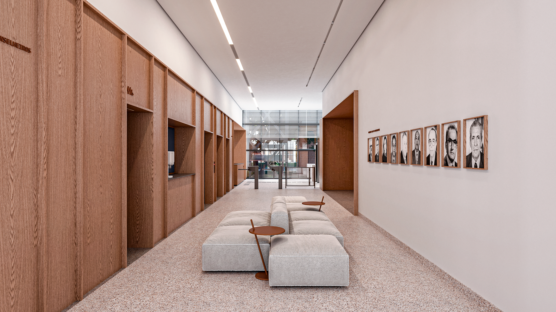A partir dos elementos de controle de fluxo, parte-se para um amplo espaço linear, que serve de circulação e abriga um espaço de estar junto à Galeria dos Presidentes e da Sala dos Conselheiros. A proposta busca reforçar o eixo principal dos espaços, onde fica o Foyer do Plenário. A utilização dos painéis atua fortemente para isso, reforçando e respeitando os direcionamentos através da retificação do espaço e de enquadramentos para os demais acessos.