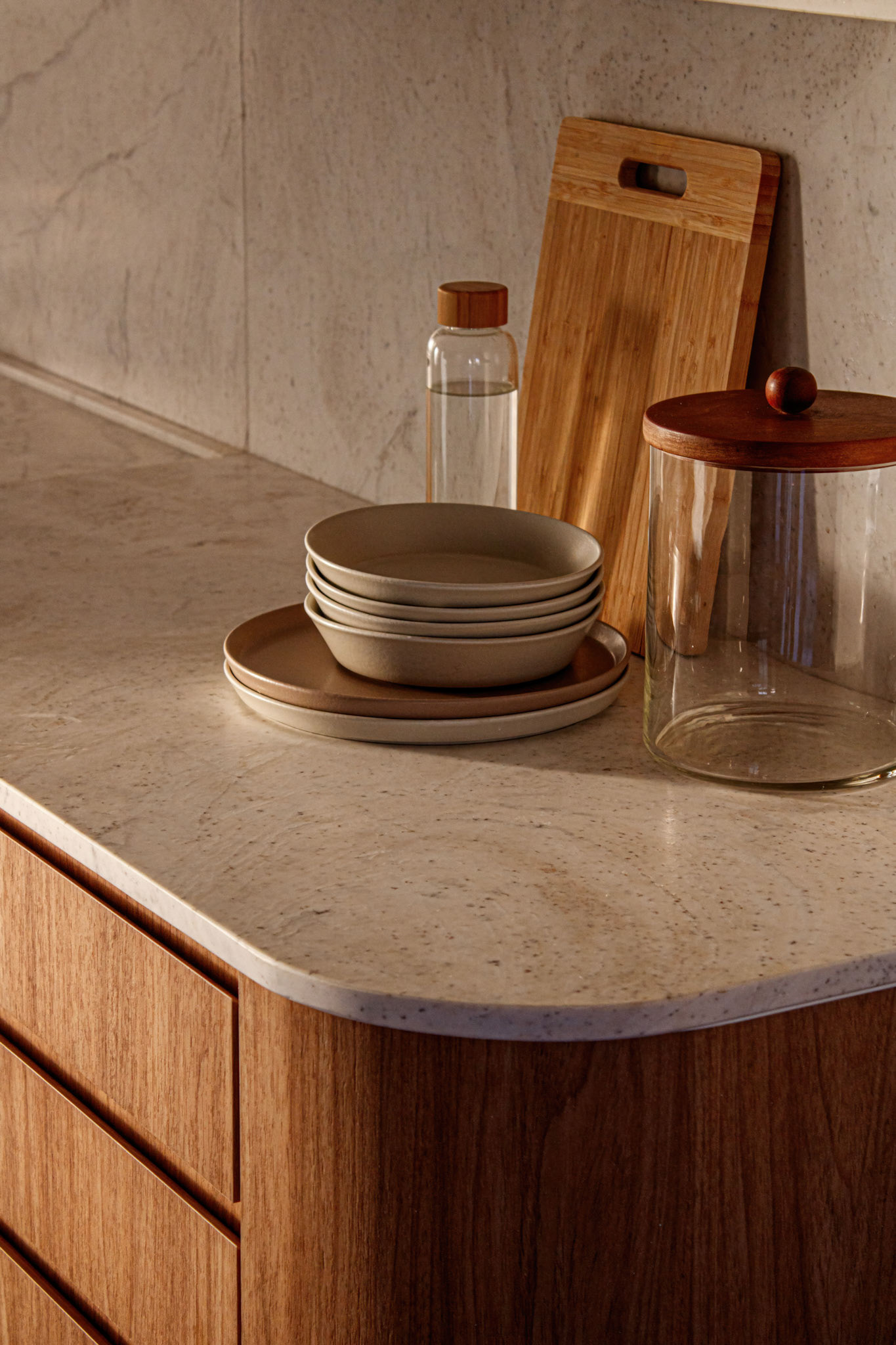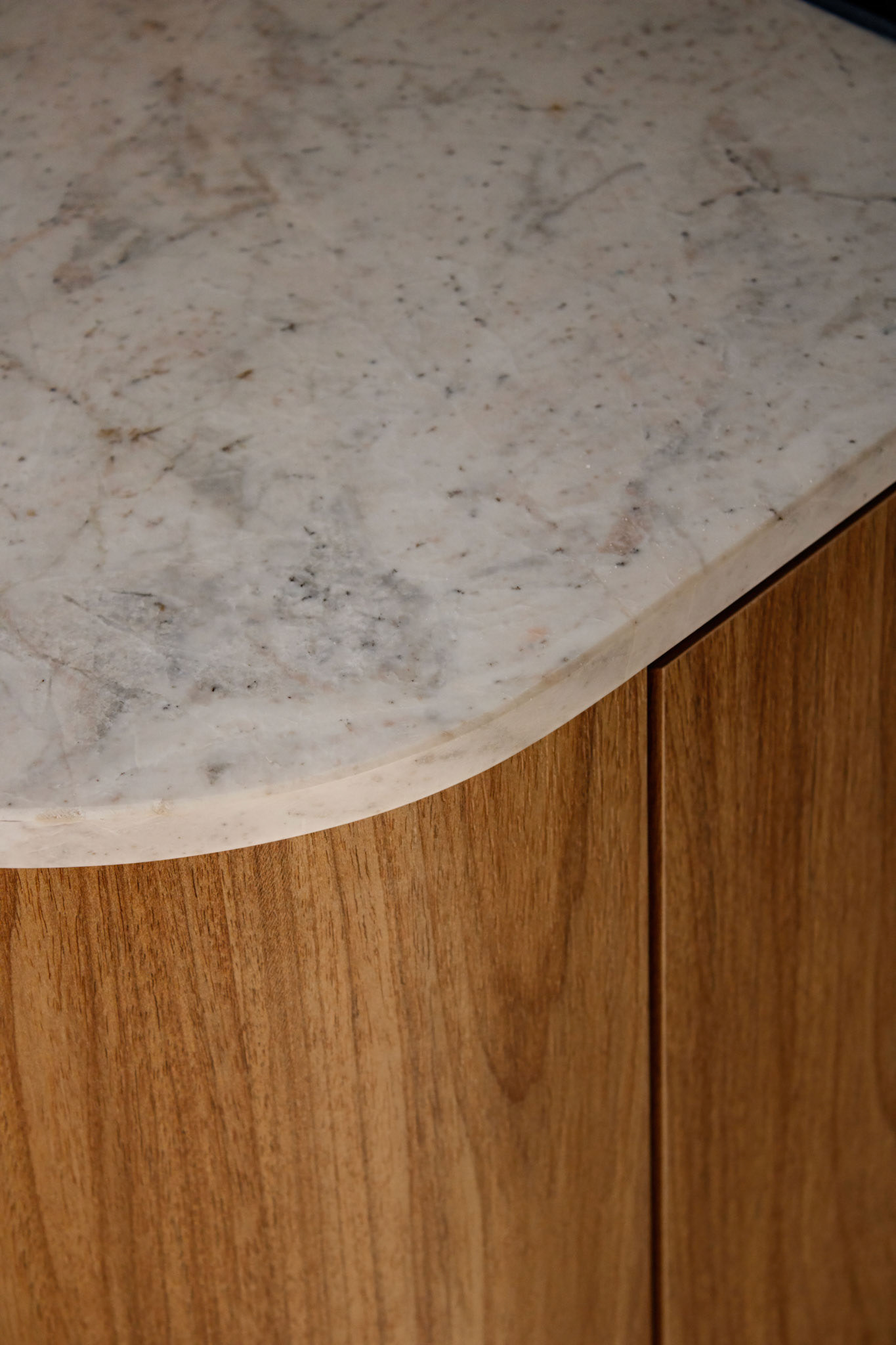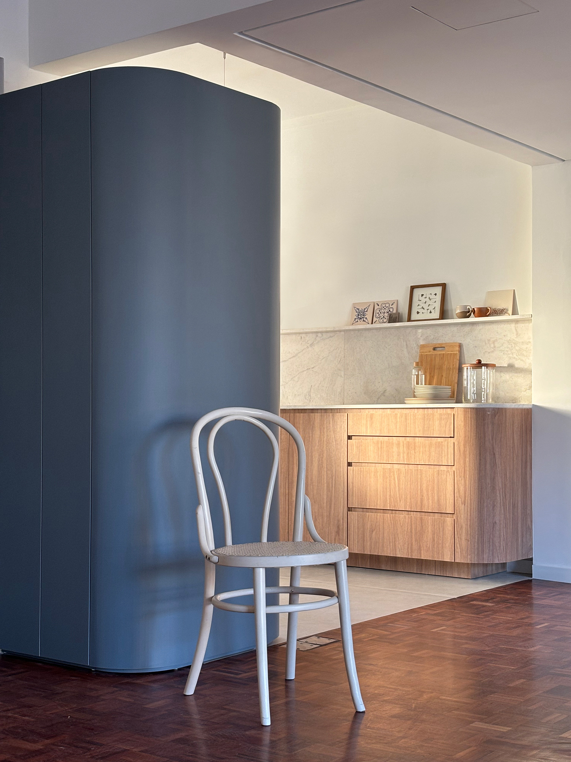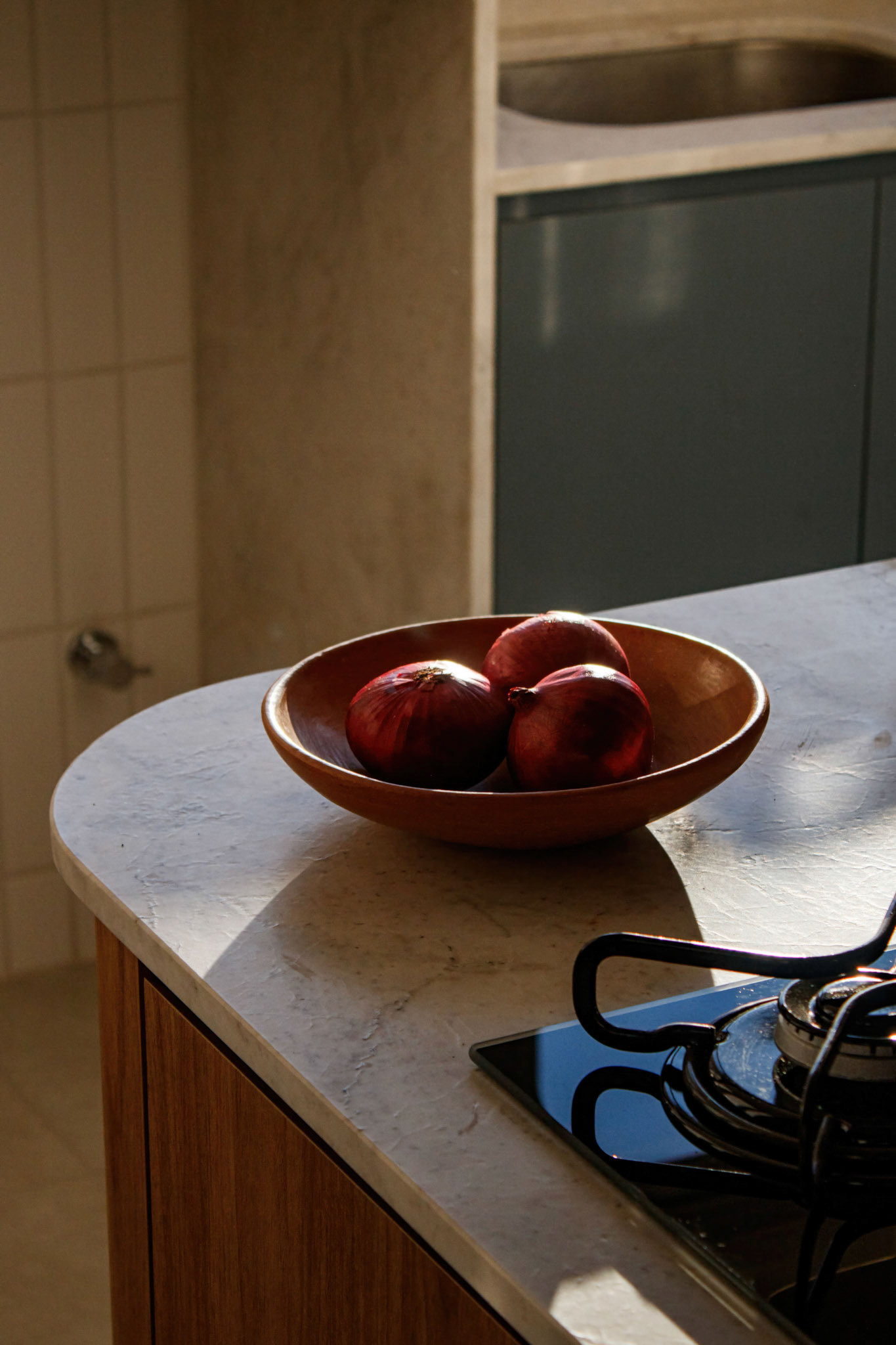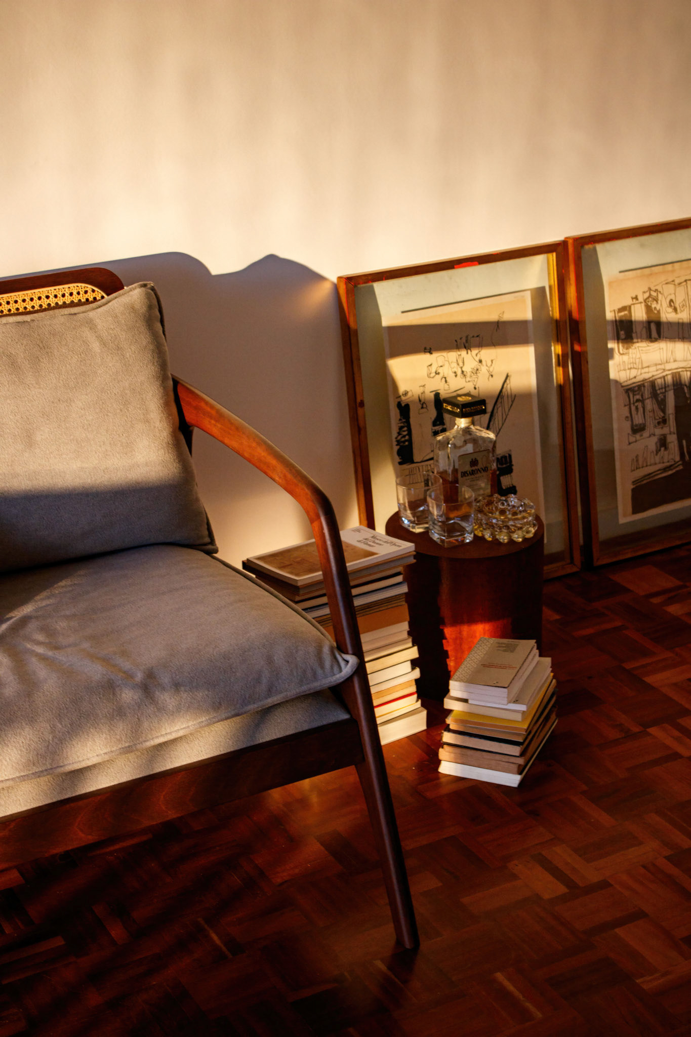 Ao mesmo tempo, o cuidado com o desenho dos elementos fixos (marcenaria, pedras), trouxe fluidez e unidade visual ao conjunto. A conversa entre materiais novos e antigos, a combinação de texturas, a presença pontual de cores fortes, porém sóbrias, resultam em uma neutralidade elegante e adicionam profundidade e caráter aos espaços.