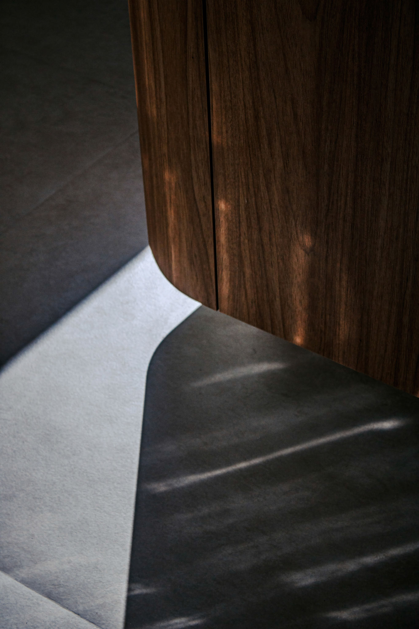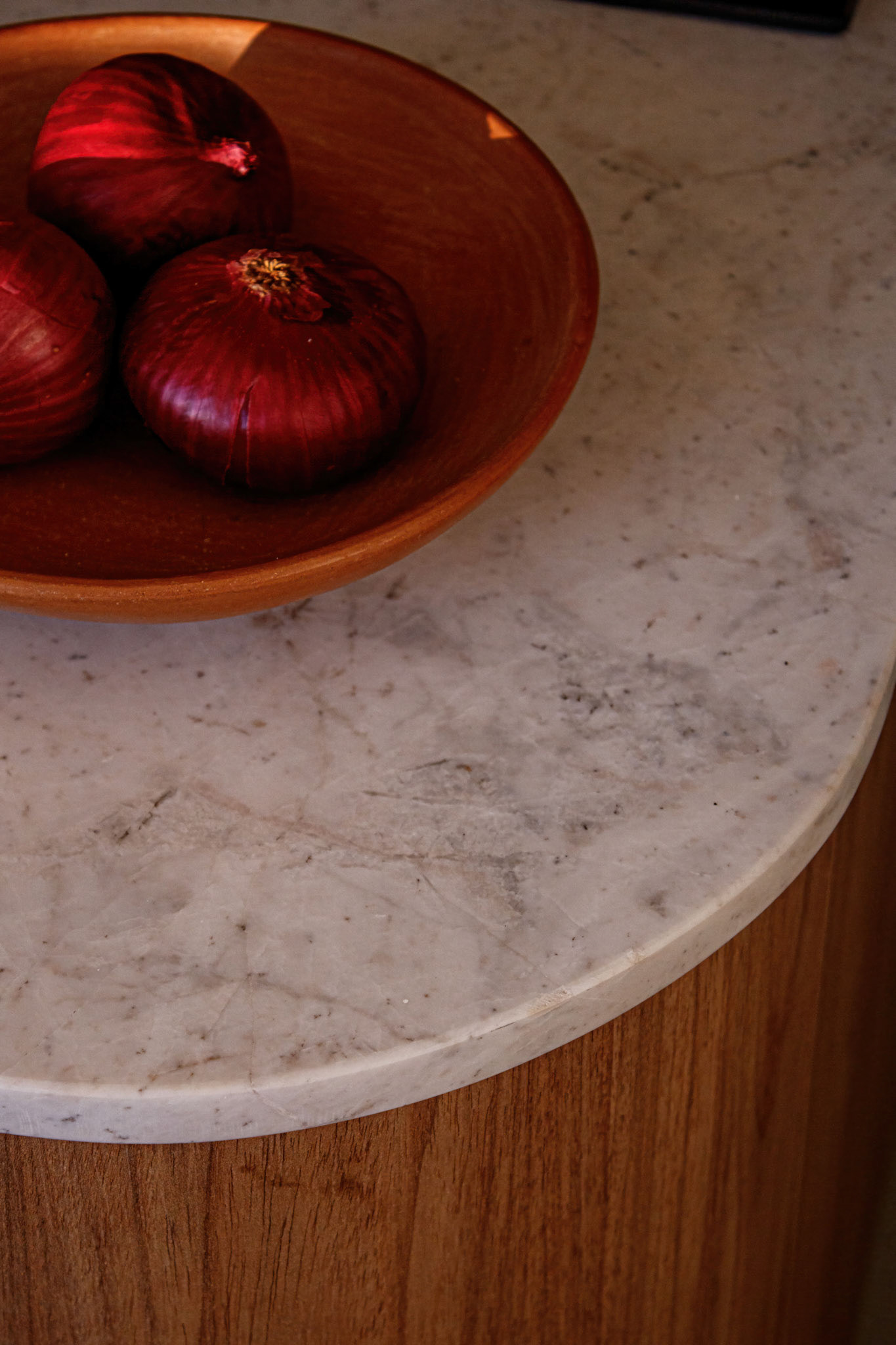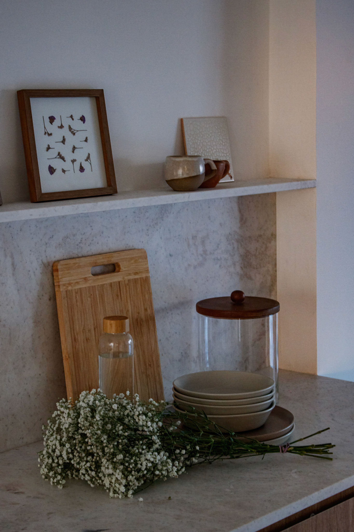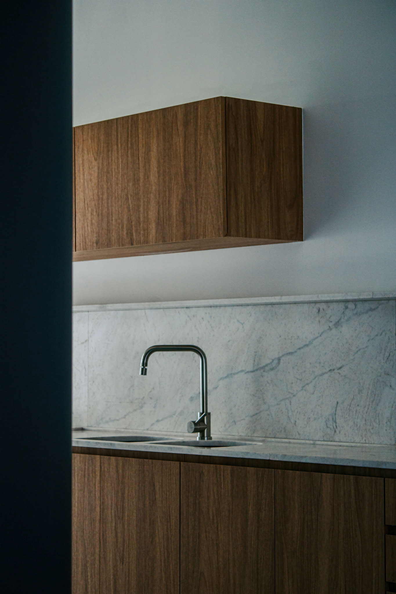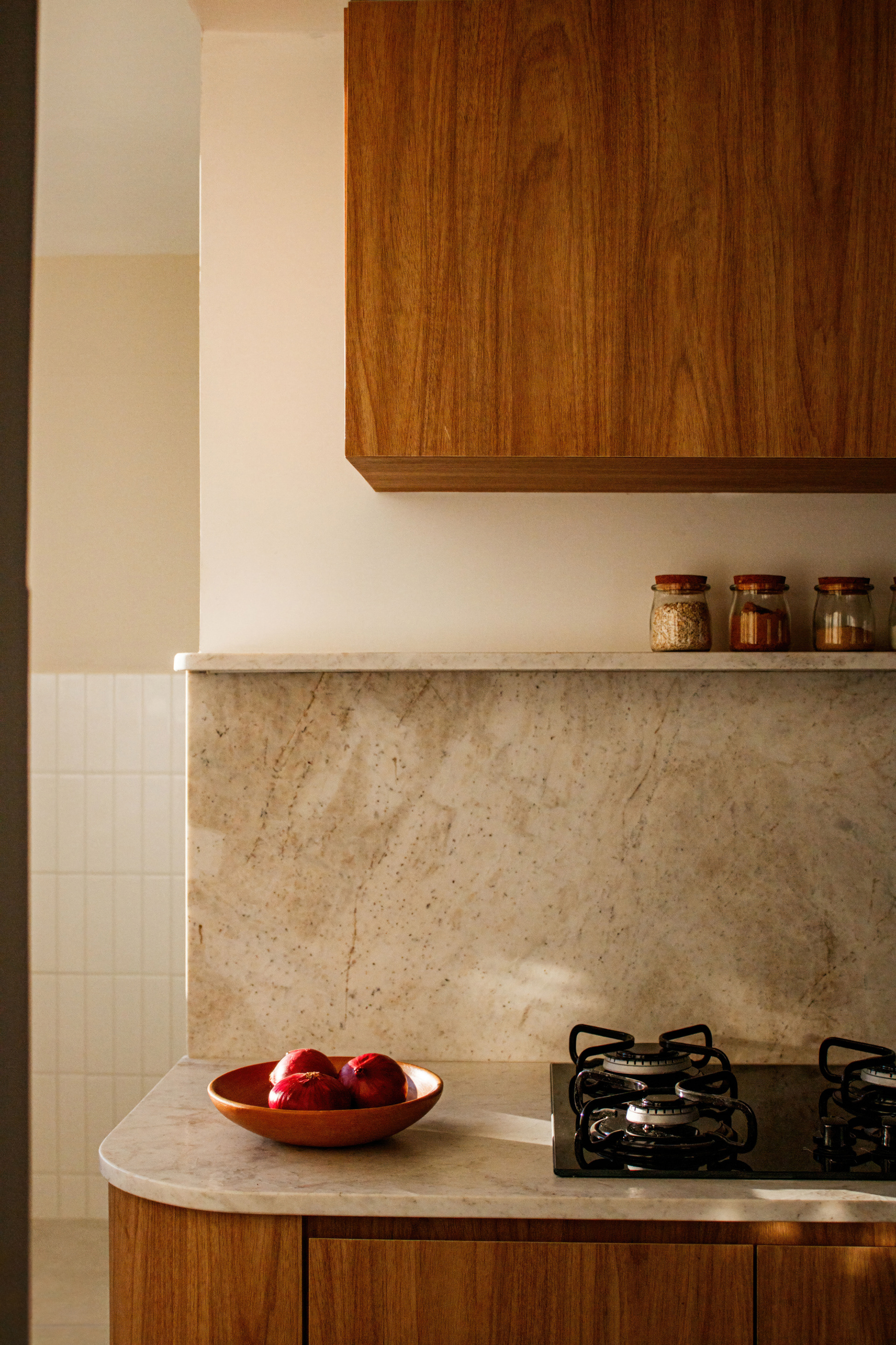 Ao mesmo tempo, o cuidado com o desenho dos elementos fixos (marcenaria, pedras), trouxe fluidez e unidade visual ao conjunto. A conversa entre materiais novos e antigos, a combinação de texturas, a presença pontual de cores fortes, porém sóbrias, resultam em uma neutralidade elegante e adicionam profundidade e caráter aos espaços.